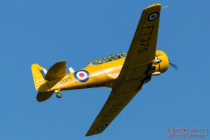 FT375 was shipped to the United Kingdom aboard the SS Esperance on April 13th 1944 and received by Rootes Securities, almost certainly at Liverpool/Speke.ย After re-assembly and flight test it was despatched to its first (and only) R.A.F. unit, No.16 (Polish) Service Flying Training School at RAF Newton, on August 23rd, 1944.ย FT375 will have been one of the first Harvardโs with the unit, as the unit only began re-equipment that month.ย It was involved in a Category B flying accident, repaired by Marshallโs at Cambridge/Teversham, April 21st until June 11th 1945.ย Shortly after the return to Newton, a further accident necessitated repair, this time by Helliwells between November 15th 1945 and April 16th 1946.ย The aircraft was not returned to No.16 SFTS, but issued to the charge of the Royal Aircraft Establishment during May 1946, with paper transfer from the Royal Air Force to Controller Services (Air) on July 31st 1947. During November 1954 FT375 moved across to the Aeroplane and Armament Experimental Establishment (A&AEE) at Boscombe Down for use as a chase-plane and photo-mount.ย It went on to serve with the A&AEE for over 40 years, alongside two other Harvards.ย Initially silver with yellow T-bands, throughout the 70s and 80s was a gloss yellow overall with UK roundels and fin flash.
